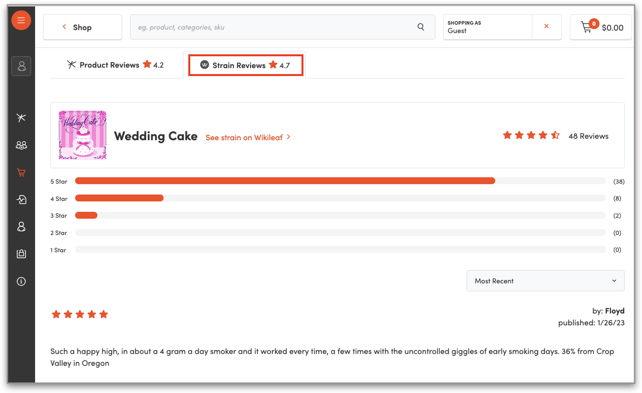 Clienteling Wikileaf Strain Reviews - We've integrated Wikileaf strain reviews into the product details page in Clienteling for products that have a strain type associated. This is similar to the functionality that has been implemented on eComm. These reviews may help with product education so that employees can provide the best customer experience (see below for a snapshot of what it looks like live in Clienteling).