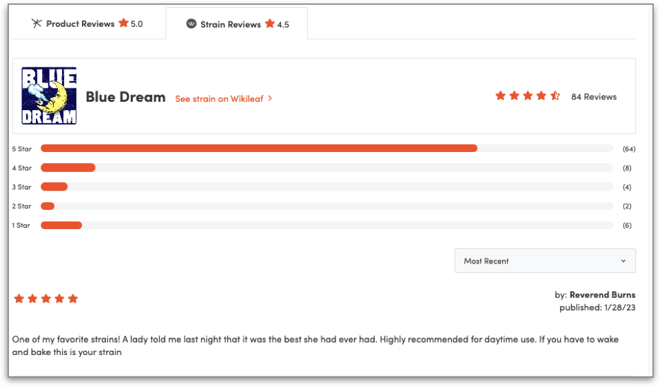 Wikileaf strain reviews - Wikileaf strain reviews now appear on eComm within the product pages for products that have a strain type associated. This will provide customers with more consumer insights while shopping online.