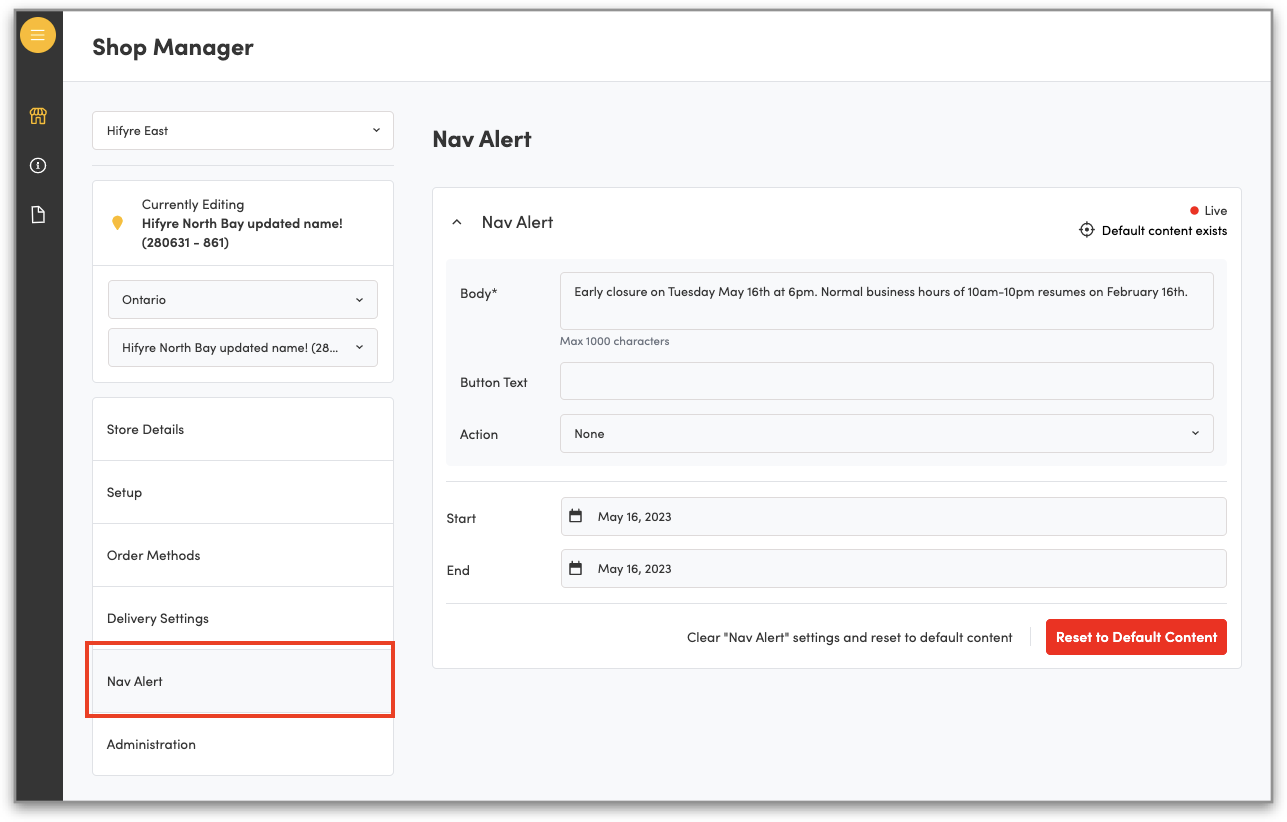 2. Select Nav Alert to add in your message in the Body and your Start & End date. The Body message will appear across the website for your shop during the selected time frame.